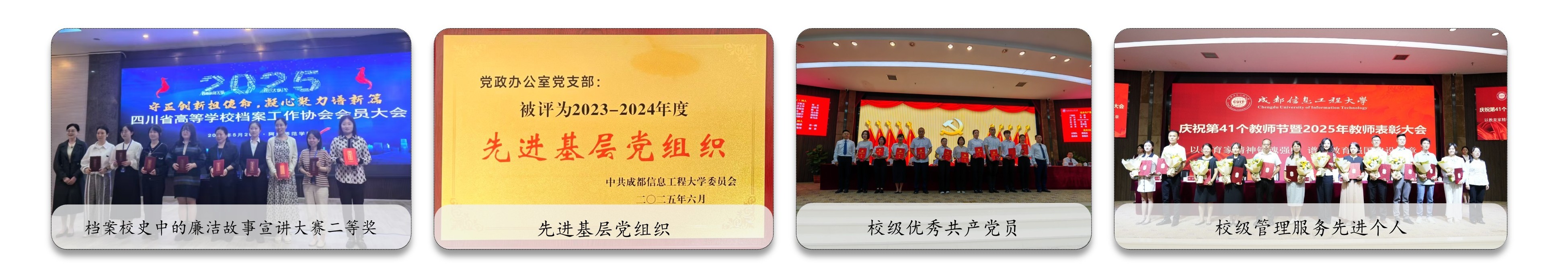 (四)强化党建引领,促进党建与业务双提升。深化“四有四强青蓝先锋”党建品牌建设,党政办公室支部获评校级优秀基层党支部,入选党建“双创”培育单位;1名同志获得四川省高等学校档案工作协会2025年会员大会“档案校史中的廉洁故事”宣讲大赛二等奖,1名同志获评校级优秀共产党员,1名同志获评校级管理服务先进个人。