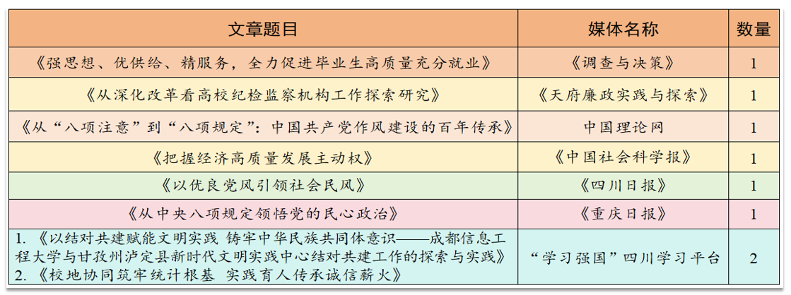 着力推动党的创新理论入脑入心、走深走实。邀请校内外专家学者作全国两会精神、党的二十届四中全会精神等专题辅导报告,提升理论宣讲的权威性和穿透力。发挥领导干部“头雁”效应,党委领导班子成员带头开展深入贯彻中央八项规定精神学习教育、省委十二届七次全会精神宣讲,强化党员干部的使命担当与行动自觉。加强理论研究与成果转化,全年在《理响中国》、《四川日报》等权威媒体发表理论阐释文章8篇,加强党的创新理论体系化学理化研究阐释。