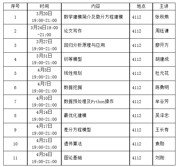 为了培养我校学生的创新意识及运用数学方法和计算机技术解决实际问题的能力,应用数学学院2025年继续组织和指导大学生数学建模竞赛系列活动,竞赛主要包括:全国大学生数学建模竞赛选拔赛(即五一数学建模竞赛),2025年全国大学生数学建模竞赛,全国高校密码数学挑战赛等。应用数学学院数学建模指导组从第4周开始培训,分别从数学建模基础、数学建模算法、数学建模竞赛、数学建模案例分析到常用软件等方面进行培训,培训安排见表1。