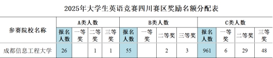 4月13日,我校2025年全国大学生英语竞赛初赛赛点分别在航空港与龙泉校区顺利举行。我校此次报名参赛人数为1042人,其中C类考生961人,B类考生55人,A类考生26人。根据全国组委会对奖励等级以及获奖名额的规定,我校各类考生的获奖名额如下图所示: