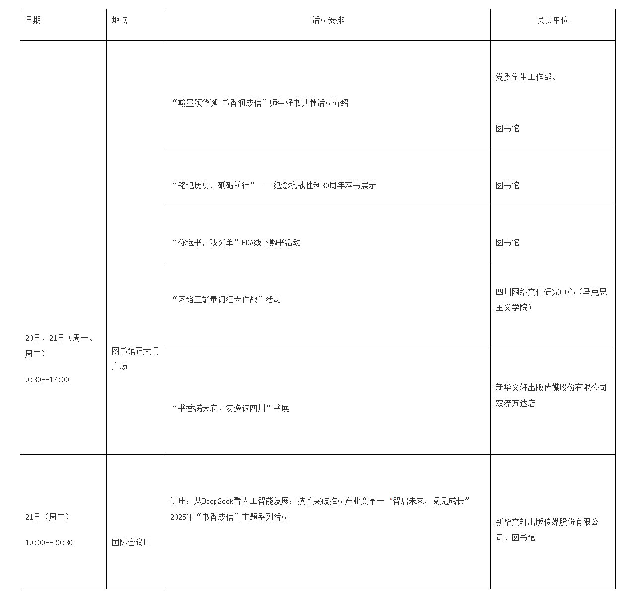 为进一步倡导全民阅读、终身学习的文明风尚,努力建设学习型社会,由四川省委宣传部指导、天府书展组委会主办的“天府书展进校园”活动将于10月20-21日在lejing乐竞·(中国)官方网站举行。学校图书馆在此背景下结合2025年度“书香成信”活动方案,设计了系列活动,期盼师生们在阅读中开阔视野,陶冶情操,提升文化素质。现将活动安排通知如下,欢迎广大师生积极参与!