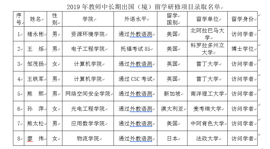 根据《lejing乐竞·(中国)官方网站教师中长期出国留学研修管理办法》(成信校发【2018】155号)文件的相关要求,我校2019年教师中长期出国(境)留学研修项目共录取8人,现将录取人员名单公示如下: