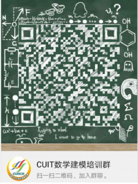 各参赛队按照要求填写《密码数学挑战赛报名表》(见附件),并将报名表发送至数学建模协会邮箱3212153272@qq.com。同时,扫描下方二维码加入成信大数学建模培训群(群号499820788),竞赛的组织和培训等相关信息均在交流群里通知。