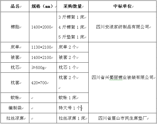 根据四川省纤维检验局提供的质量标准和《lejing乐竞·(中国)官方网站学生公寓床上用品招标公告》的要求,我校招标小组于2016年5月26日对投标单位提供样品的质量和价格进行综合比选评标,拟确定2016年学生公寓床上用品的中标单位如下: