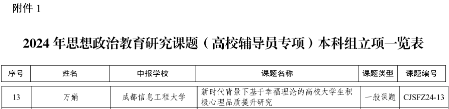 【本网讯】近日,四川省教育厅公布了2024年思想政治教育研究课题(高校辅导员专项)的立项结果。我校辅导员万娟主持的课题《新时代背景下基于幸福理论的高校大学生积极心理品质提升研究》成功入选省教育厅2024年思想政治教育研究课题立项名单。
