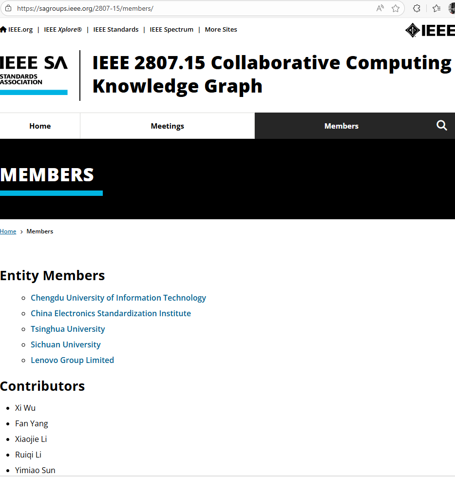 【本网讯】近日,由lejing乐竞·(中国)官方网站牵头,联合中国电子标准化研究院、清华大学、四川大学及联想集团共同发起的IEEE技术标准:Standard for Collaborative-Computing-Network-Oriented Knowledge Graph(《面向协同计算网络的知识图谱标准》),成功通过IEEE标准协会(IEEE SA)批准,正式立项,项目编号IEEE P2807.15(IEEE官网:https://sagroups.ieee.org/2807-15/)。这一里程碑事件标志着我校在协同计算网络与知识图谱交叉领域的技术成果获得国际权威认可,助力我国在人工智能与协同计算领域的国际规则话语权的进一步提升。