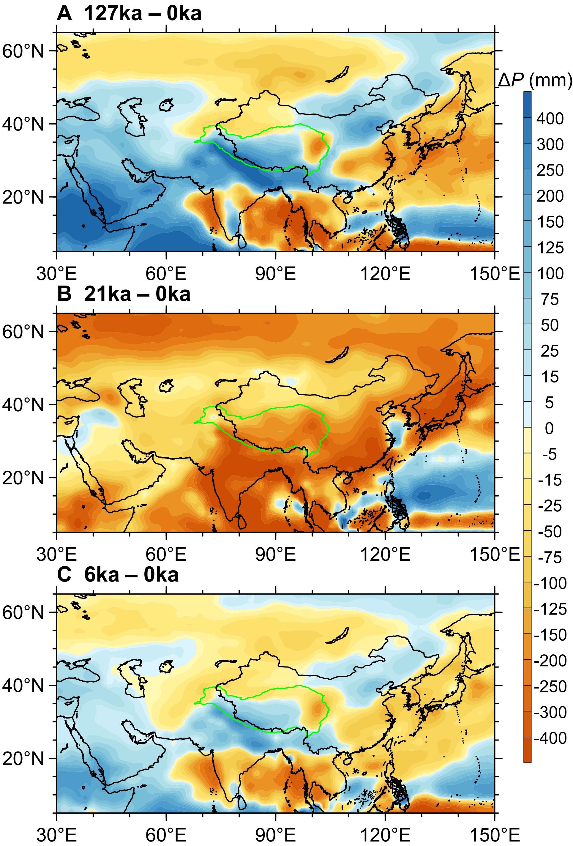 图3. PMIP4模拟的末次间冰期(A)、末次冰期(B)和全新世(C)亚洲降水变化空间差异图