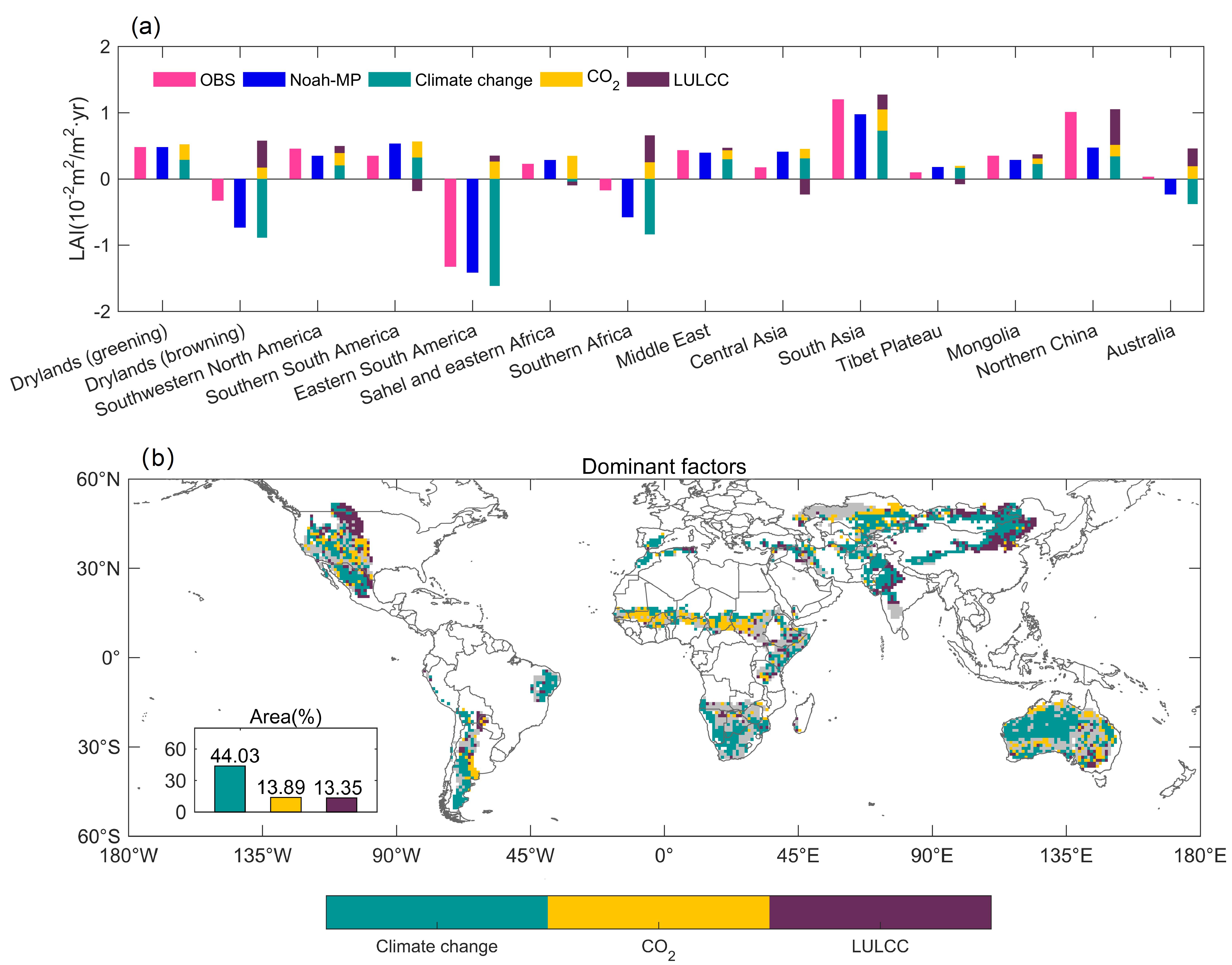 研究结果表明,考虑根系动态吸水过程的Noah-MP陆面模式对模拟全球干旱半干旱区LAI的变化趋势和年际变化方面表现优异,能够再现71.26%的干旱半干旱区的LAI变化趋势空间格局,与TRENDY实验下13个模式多模式平均LAI相比,Noah-MP模式对模拟全球干旱半干旱区和区域LAI年际变化的表现能力更好。结果显示,由气候变化主导LAI变化趋势的面积(44.03%)约为由CO2主导LAI变化趋势的面积(13.89%)的3倍,且气候变化对全球干旱半干旱区植被增加和植被减少的区域贡献最大。土地利用/土地覆盖主导了约13.35%的干旱半干旱区LAI变化趋势,这与生态恢复工程的实施、木本植物入侵和农业集约化等有关。总体而言,二氧化碳变化对全球干旱半干旱区植被变化的影响有限。研究人员进一步将基于Noah-MP模式的归因结果与已发表的区域研究结果进行对比验证,Noah-MP的模拟结果可以得到较好的验证,表明了基于Noah-MP模式模拟结果的LAI变化归因的合理性和可靠性。