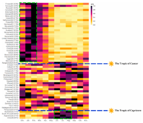 1. 多年月平均流感高峰。采用Min-Max归一化方法将月平均IPR数据归一化到0-1的范围。蓝色的虚线是北回归线或南回归线。绿色的虚线框是北回归线以北和南回归线以南国家流感主峰。