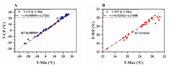 2. 流感峰值的2m温度与每个国家的温度之间的相关性分析。T-CP/WP:冷季或暖季流感高峰的2m温度。T-Min/Max:各国的最低或最高2m温度。(A)冷季流感高峰的2m温度与最低2m温度之间的相关性。(B)暖季流感高峰2m温度与最高2m温度之间的相关性。