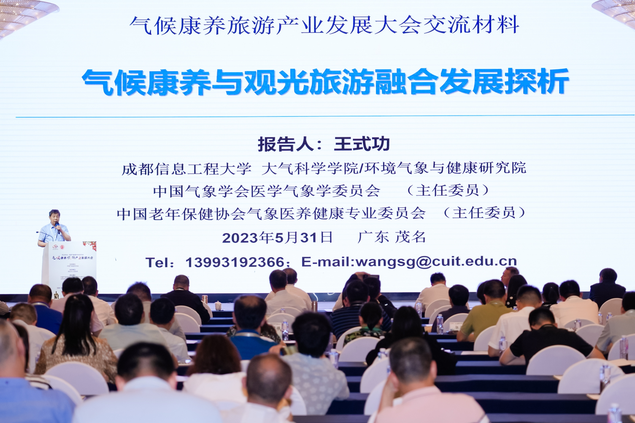 【本网讯】5月31日至6月1日,由中国气象服务协会主办,茂名市人民政府协办,中国气象服务协会旅游气象专业委员会、全联城市基础设施商会文旅新融合分会、茂名市气象局、茂名市文化广电旅游体育局承办的2022-2023年会气候康养旅游产业发展大会在广东茂名召开,中国气象服务协会会长许小峰、中国非物质文化遗产保护协会会长王晓峰、中国气象局原副局长余勇、茂名市人民政府副市长高雪山、广东省气象局副局长曾琮、广东省文化和旅游厅二级巡视员李再炎、中国气象服务协会常务副会长孙健、全联城市基础设施商会文旅新融合分会会长彭志凯等领导出席会议,我校大气科学学院王式功教授和管理学院黄萍教授应邀在会上作专题报告。