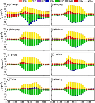 图2.成都平原8个城市各物理/化学过程引起的地面O3小时浓度的变化
