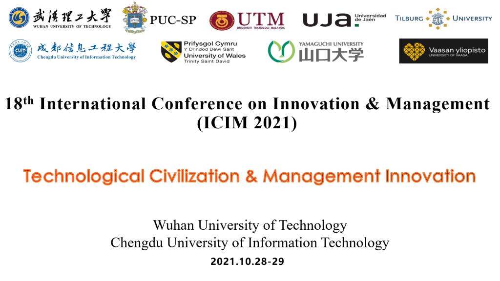 【本网讯】10月28日-29日,在我校的积极组织和支持下,第18届创新与管理国际学术会议(International Conference on Innovation & Management)(ICIM2021)成功在线举办。该会议每年举办一届,属于ICCA(国际大会与会议协会)标准认证的国际协会会议。本届会议以“科技文明与管理创新(Technological Civilization & Management Innovation)”为主题,由lejing乐竞·(中国)官方网站、武汉理工大学、荷兰蒂尔堡大学、日本山口大学、巴西圣保罗大学、马来西亚理工大学、芬兰瓦萨大学、英国威尔士三一圣大卫大学、西班牙哈恩大学联合主办,我校管理学院承办。