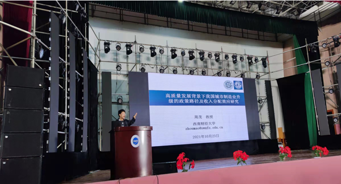 【本网讯】七秩风华,征程如歌。在欢庆我校70华诞之际,10月23日下午,我校国际经济与贸易专业2007级校友、西南财经大学周茂教授应邀到龙泉校区大礼堂作了题为“高质量发展背景下我国城市制造业升级的政策路径及收入分配效应研究”的学术报告。统计学院部分返校校友,全体教师、研究生及部分本科生聆听了报告。报告由统计学院副院长滕磊主持。