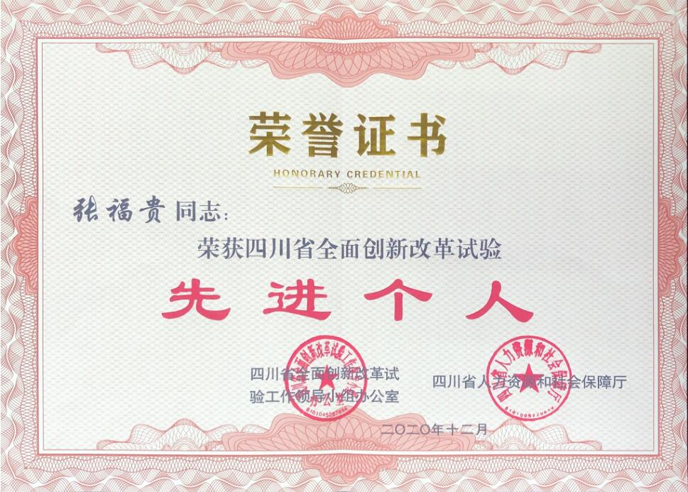 【本网讯】12月25日,为弘扬先进、树立典型,进一步营造全社会支持改革、鼓励创新的氛围,四川省全面创新改革试验工作领导小组办公室、四川省人力资源和社会保障厅印发《关于表彰四川省全面创新改革试验先进集体和先进个人的决定》(川全创办〔2020〕2号),对全省77个先进集体和150名先进个人予以表彰。我校电子工程学院(大气探测学院)副院长张福贵教授被授予“四川省全面创新改革试验先进个人”荣誉称号。