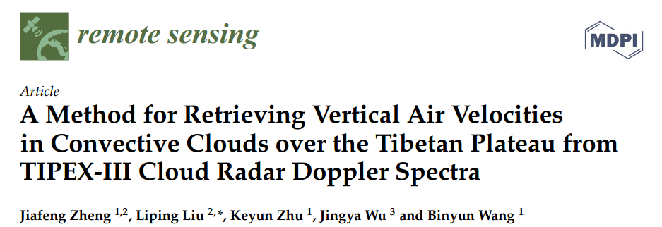 【本网讯】在第三次青藏高原大气科学试验项目、国家自然科学基金、中国气象科学研究院灾害天气国家重点实验室基金的支持下,我校大气科学学院郑佳锋博士近日以第一作者身份在国际知名期刊《Remote Sensing》-Atmospheric remote sensing (IF=3.244,JCR二区)上发表了题为《A Method for Retrieving Vertical Air Velocities in Convective Clouds over the Tibetan Plateau from TIPEX-III Cloud Radar Doppler Spectra》的学术论文。
