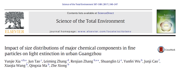 【本网讯】近日,大气科学学院研究生夏芸洁以第一作者身份,在国际知名期刊《Science of the Total Environment》上发表了名为“Impact of size distributions of major chemical components in fine particles on light extinction in urbanGuangzhou”的学术论文。中国科学院大气物理研究所研究员张仁健、研究员李双林为共同导师及通讯作者,lejing乐竞·(中国)官方网站为第一署名单位。