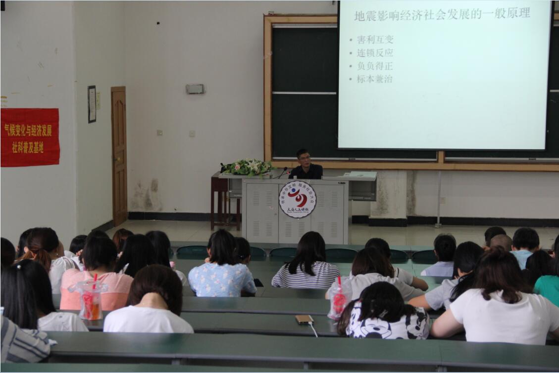 【本网讯】6月2日下午,应我校气候变化与经济发展基地邀请,四川省社会科学院震灾研究中心秘书长、副研究员、经济学博士曹瑛于龙泉校区3101教室,为商学院的同学们作题为《地震灾害经济学理论与实践》的讲座。曹瑛博士以他多年来的自身研究成果和经验,对地震灾害经济学相关概念进行阐释,梳理了地震影响经济社会发展的一般原理和特殊规律,分享了生活中的一些典型案例,并和同学们一起探讨了地震灾后恢复重建规律和如何有效地进行防灾减灾。