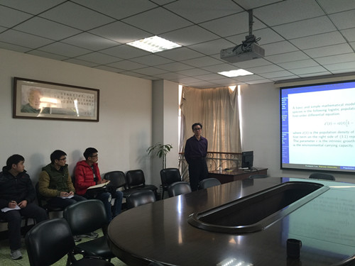 报告会中,兰教授主要针对具有收获率的人口模型,介绍了他最近获得的一些新成果,并分享了他在这方面的研究经验,包括该模型还有哪些部分值得去深入研究,而另外一些内容则已经探讨得比较多了,已没有继续研究的价值。 随后,兰教授还同在座研究生们进行了交流。他建议同学们做论文要学会总结,要从不同好文章中获取灵感,这样才能写出自己优秀的东西。最后,兰教授就研究生同学的提问给出了细心的解答,比如平衡解是什么意思?采用行波解有没有意义等。
