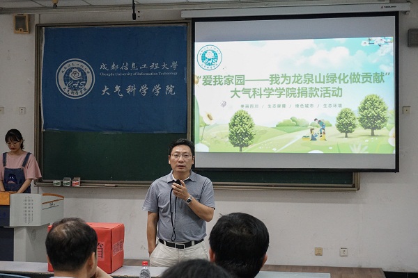【本网讯】  6月14日中午,大气科学学院在航空港校区1106教室举行“爱我家园,我为龙泉山绿化做贡献”捐款活动。学校党委副书记马洪江、大气科学学院的领导、部分老师以及学生干部代表参加了活动。