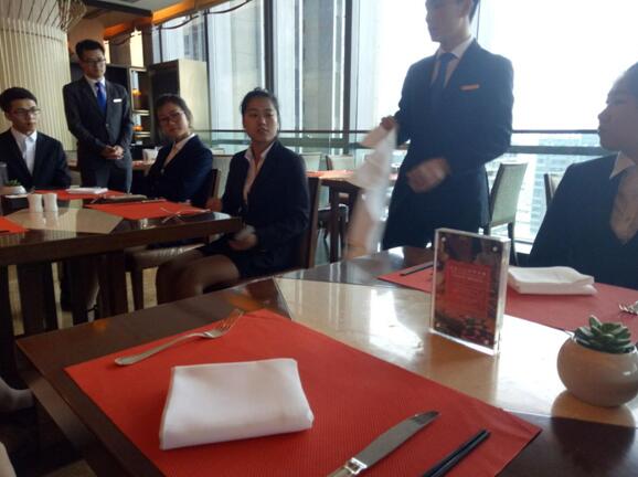 餐饮部经理为同学们上了一堂现场的餐饮礼仪课,讲解了西餐文化、餐饮摆台、用餐礼仪等内容。