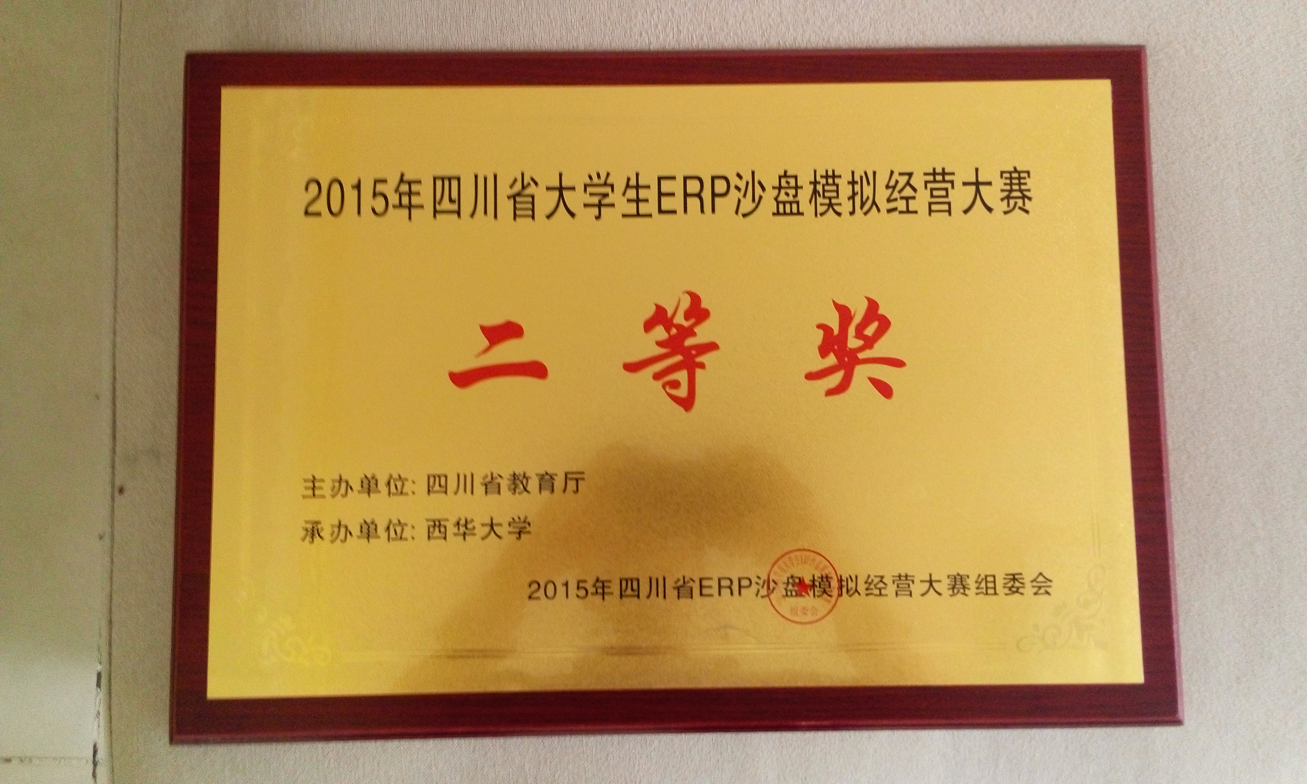 5月29至31日,来自四川地区的27支高校代表队齐聚西华大学,展开激烈的对抗。经过校内比赛的激烈选拔,唐筱、符春艳、李思瑶、钟志贤、李梦琴、张颖代表我校参加了该项赛事。在比赛中,我校代表队的六名成员在连续两天六年的模拟企业经营中,凭借良好的专业素质、积极的团队协作,有效分析市场预测,争取订单,筹措资金,进行模拟企业生产运作,制定适时合理的运营策略,解决了企业模拟企业经营中面临的各种难题,最终喜获得2015年四川省大学生ERP沙盘模拟经营大赛二等奖。学校团委、教务处对本大赛给予了大力支持。