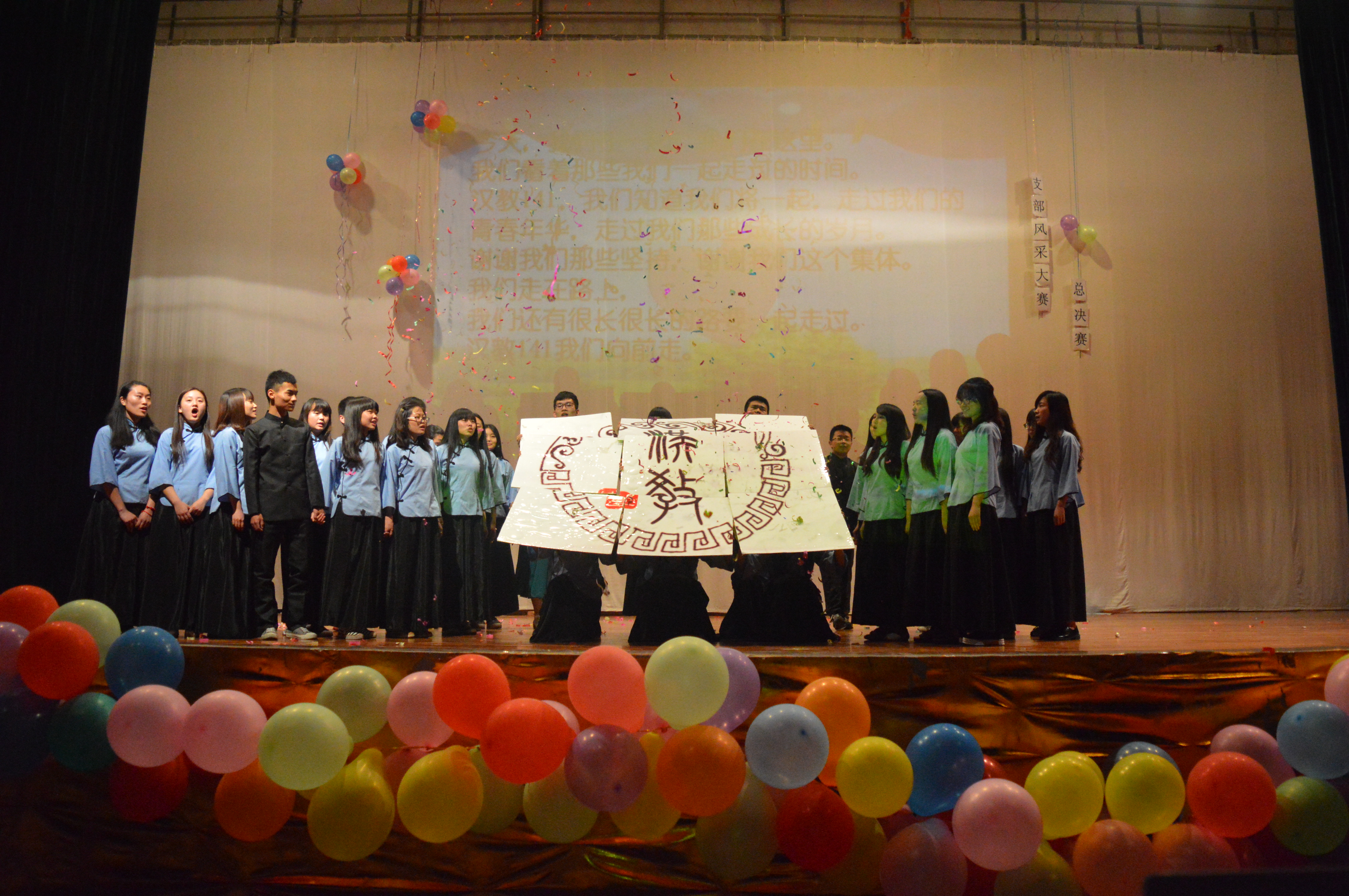 4月27日、5月10日,决赛分别在学校龙泉校区和航空港校区举行。在风采展示环节中,各团支部结合各自专业特色、班级文化为现场观众带来精彩的表演。竹竿舞、情景剧、手语歌、交谊舞、轮滑、魔术及歌舞展示等丰富了大家的视野。特别是汉语国际教育2014级1班团支部结合自身专业特点,选取了《在水一方》作为班级风采展示的环节,以诗歌诵读、歌唱、情景剧的形式并辅以民国时期大学生校服展现班级文化,赢得了在场的阵阵掌声。应用数学2014级1班团支部则以生活中最为常见的数学符号,通过专业射灯下的白手套手势动作,为同学们带来了一场美轮美奂的数学盛宴,简单的加减乘除、坐标抛物线等等,将各种数学元素融入班级文化,在展示自己支部风采的同时,激发了同学们对数学的学习激情。微信墙上,同学们的热情话语、加油助威、呐喊声不断,尤其在抽奖环节,现场高潮此起彼伏。