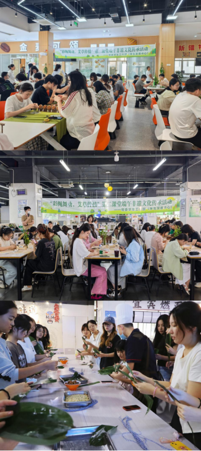 【本网讯】为弘扬中华优秀传统文化,增强学生对传统节日的文化认同感与参与感,提升学校“第二课堂”传统文化育人功效,丰富“一站式”学生社区文化内涵,5月22日和5月29日,学校分别在航空港校区和龙泉校区学生食堂开展第二课堂端午非遗文化传承活动。活动由学生工作处(学生发展中心)主办,管理学院和文化艺术学院承办,两校区600余名师生参与活动,在劳动实践中传承文化,迎接端午佳节的到来。