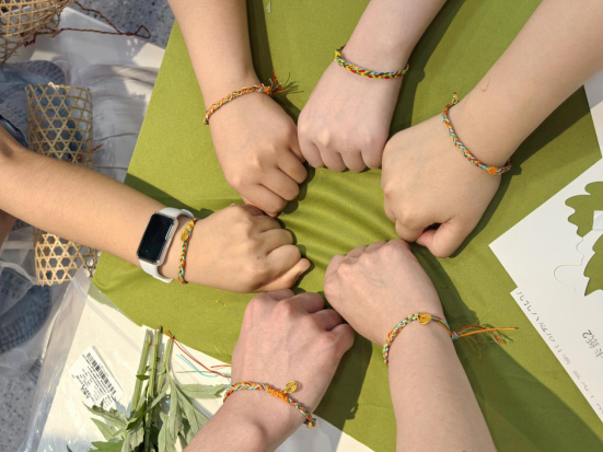 活动伊始,老师向同学们详细讲解了端午编花线绳习俗的历史渊源与文化内涵。五彩绳又称“长命缕”,源自汉代,古人认为五色丝线象征五行相生,佩戴它能驱邪避灾、祈福安康。在老师的指导下,同学们潜心研习编织技法,手指灵动翻飞。大家相互切磋、携手并进,将理论知识与实践操作完美融合,每一缕彩绳的缠绕,都交织着专注与热忱,每一个绳结的缔结,都凝聚着智慧与巧思。