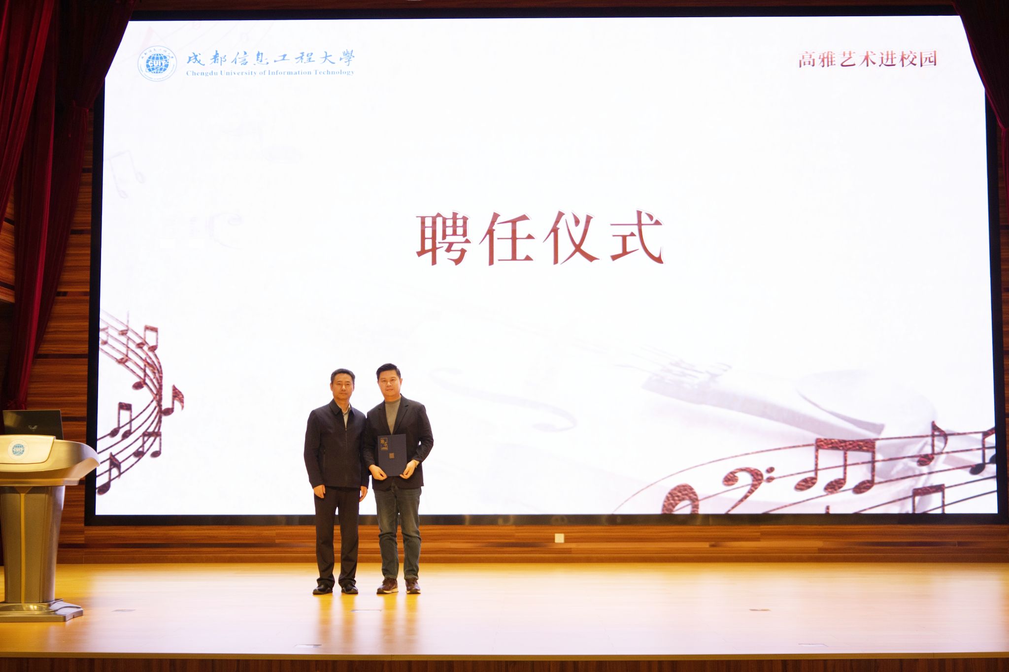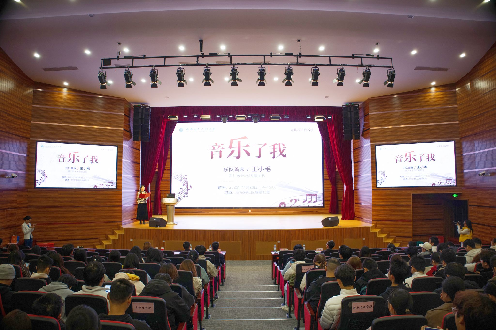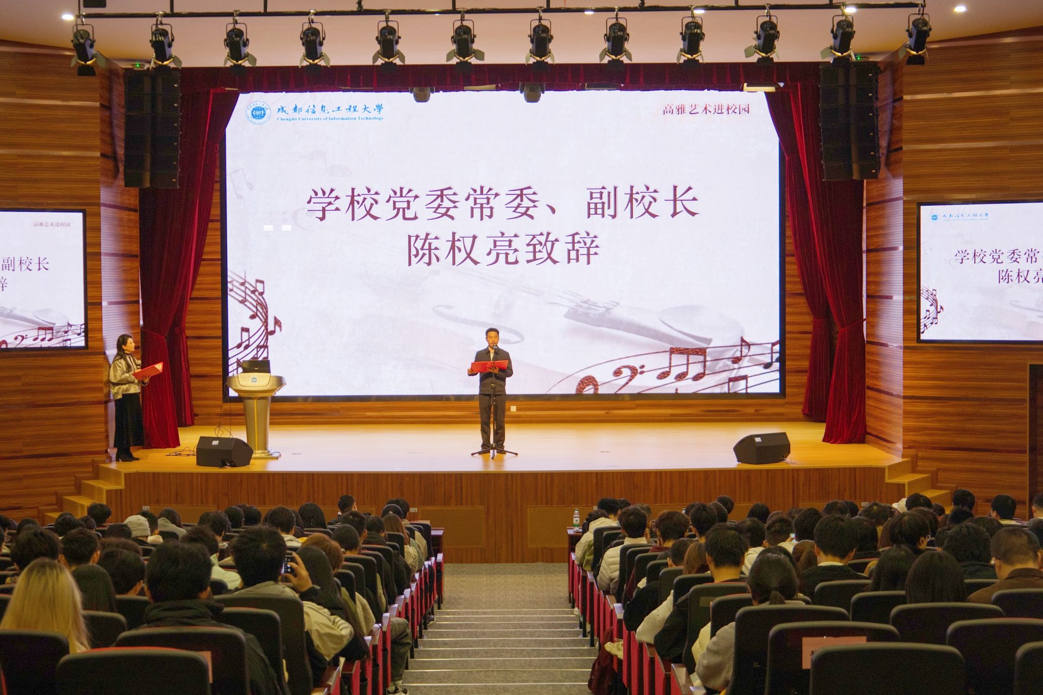 【本网讯】11月20日,2025年高雅艺术进校园“音乐了我”艺术鉴赏讲座在航空港校区成信礼堂举行。学校副校长陈权亮,四川爱乐乐团副团长、乐队首席王小毛,校团委书记刘琰琰,党委学生工作部副部长冯阳,以及四百余名师生代表参加活动。