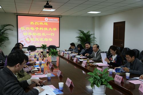 【本网讯】3月27日上午,杭州电子科技大学副校长胡华一行七人来我我院考察交流。学院副院长何建新、计划财务处处长李萍、教师教学发展中心副主任吴四九、电子工程学院副院长杨玲、控制工程学院副院长严寒冰、教务处副处长何晋等接待了来访客人,并在第九会议室进行了座谈。