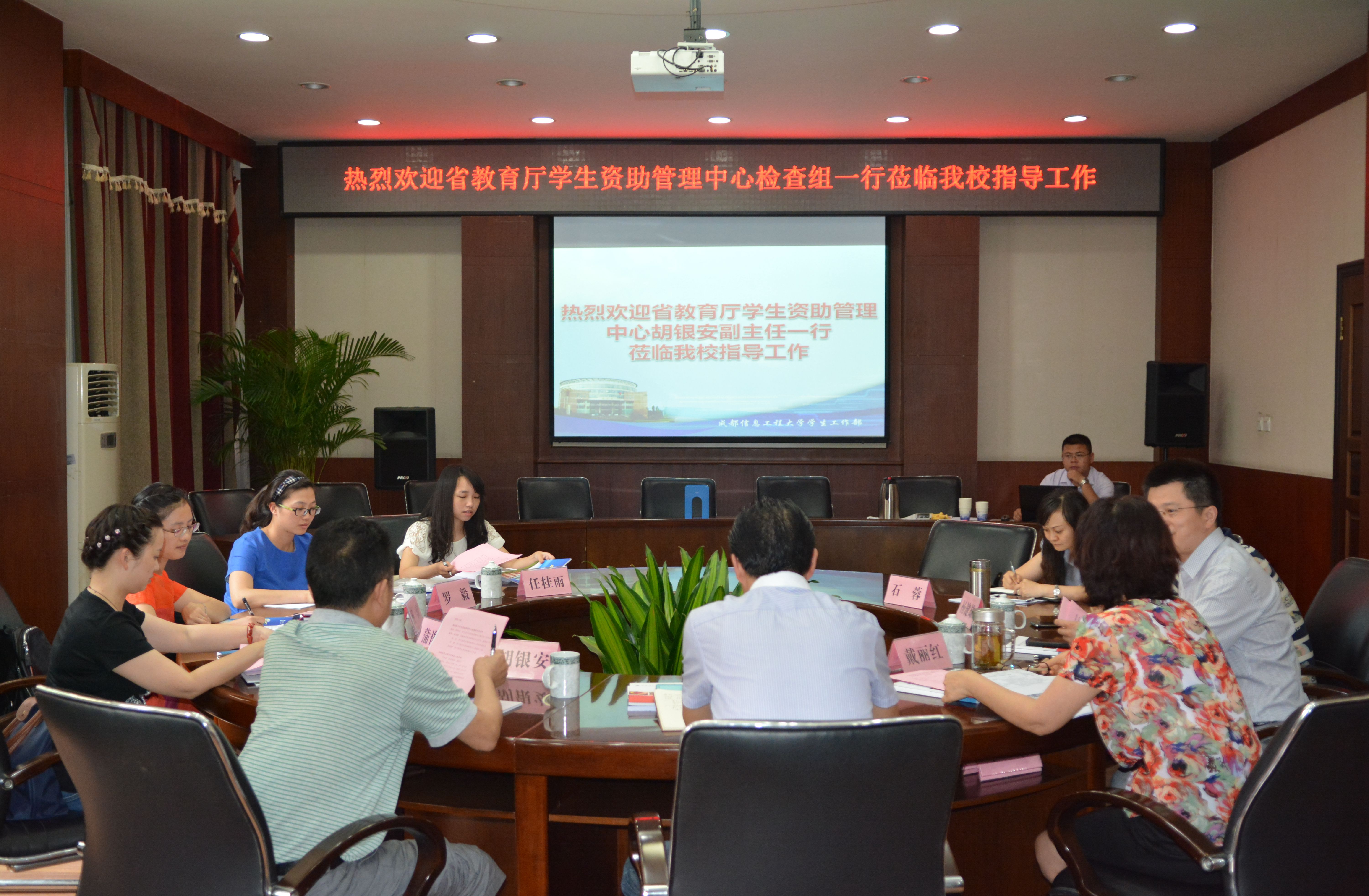 【本网讯】6月3日下午,四川省教育厅学生资助管理中心副主任胡银安一行五人,对我校学生资助工作进行了专项检查和调研。学校在第六会议室举行了工作汇报会。学校副校长于世祥,学工部部长戴丽红、学工部相关同志参加了汇报会。会议由学工部副部长陈智勇主持。