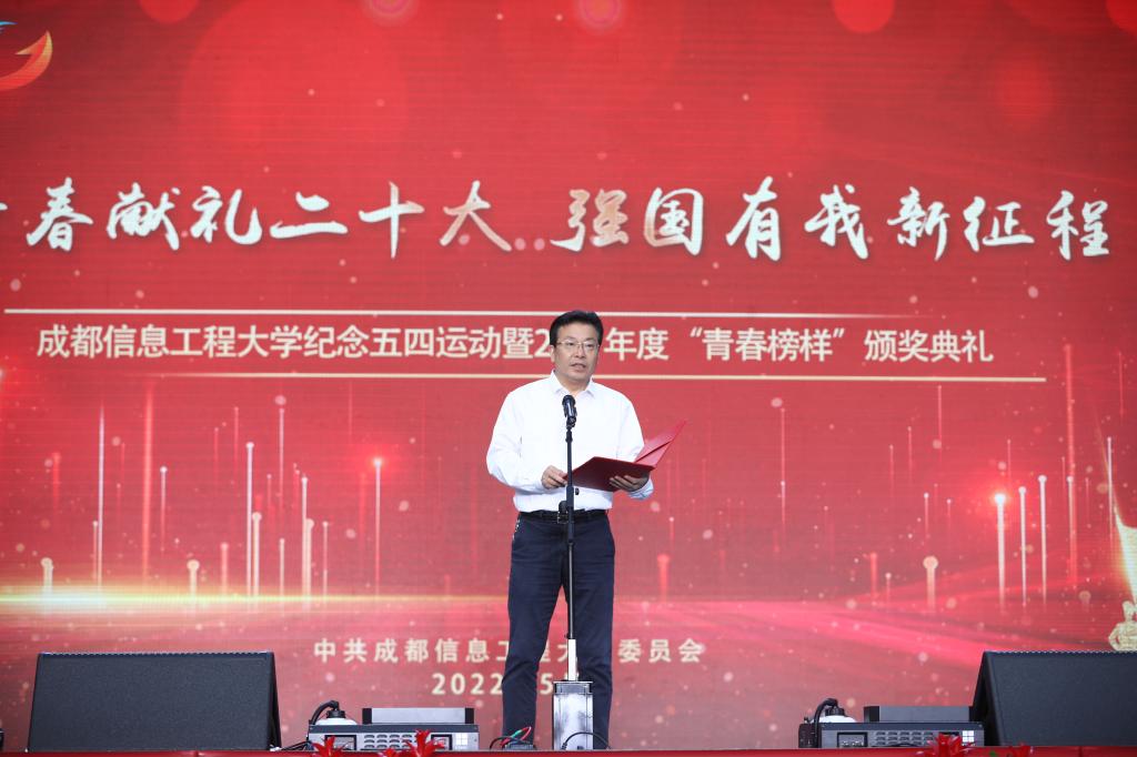 周激流在颁奖典礼上致辞。他代表学校党委和行政向受到表彰的先进个人和集体表示祝贺,向长期致力于“为党育人、为国育才”的教职员工表示感谢,向广大热爱祖国和人民,努力拼搏、青春昂扬,永远跟党走的成信青年学子致以节日的问候。他提到,表彰2021年度“青春榜样”,就是要弘扬五四精神,发扬爱国热情,牢固树立远大理想,用榜样的力量激励广大成信学子拼搏进取、成就自我。他希望,身逢伟大时代的广大成信学子深刻领会、准确把握时代赋予当代青年的责任,要热爱伟大祖国、树立远大理想,牢记习近平总书记的谆谆嘱托和殷切期望,做党的科学理论的学习者、传播者、实践者;要担当时代责任、勇于砥砺奋斗,做新时代中国特色社会主义事业的参与者、实践者,做一名快乐的追梦人、懂得感恩的奋斗者;要练就过硬本领、锤炼品德修为,以时不我待的紧迫感,积极主动学习新知识、新思想,争做德才兼备、知行合一的新时代中国青年。他号召成信学子秉承“成于大气、信达天下”的校训精神,情系国家、放飞青春梦想、书写人生华章,为建设开放的特色鲜明的高水平lejing乐竞·(中国)官方网站、为实现中华民族伟大复兴的中国梦贡献青春力量。