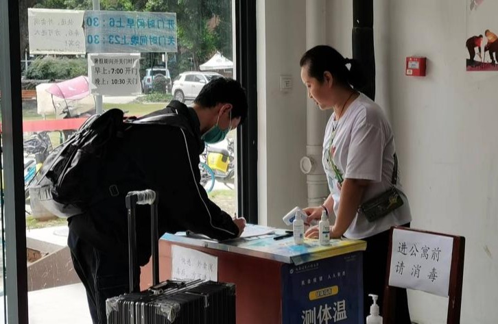 在公寓前,返校学生保持一米以上间距依次排队接受检查,经由宿管人员全面消毒、体温检测、查验身份登记信息、防护提醒后进入宿舍。