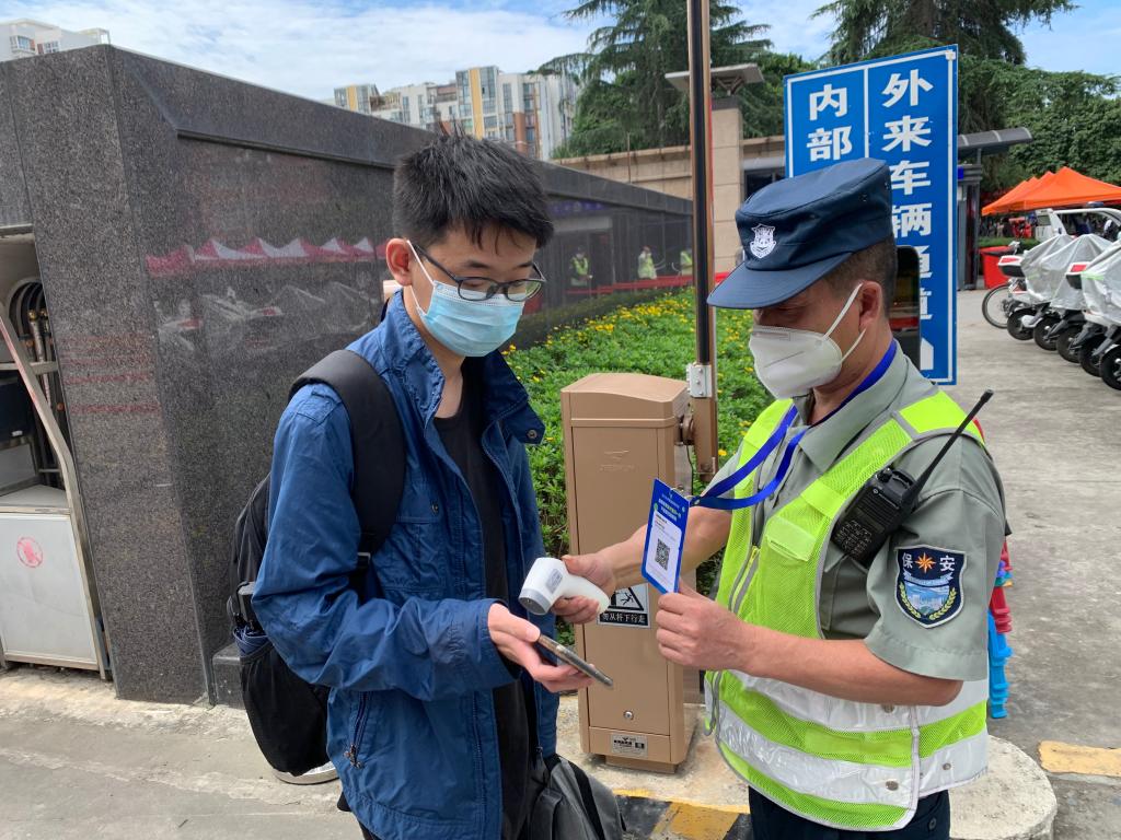 返校现场,学生在学校门口安保人员和志愿者的指引下,按照地面安全间距标识,依次排队,在完成健康码认证、信息登记、体温检测及身份核验等流程后有序进入校园。