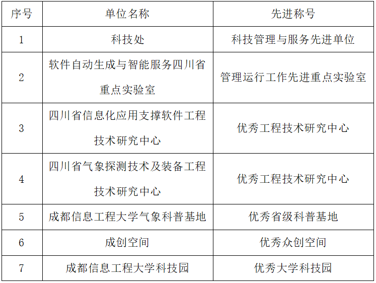 会上对2022年度科技创新工作成效突出的41家部门(单位)以及有关市(州)科技局、园区、平台予以通报表扬。在部门(单位)先进表彰名单中,学校科技处获“科技管理与服务先进单位”,此次共有川大、电子科大等10所高校的科研管理部门获得表彰;在平台先进表彰名单中,软件自动生成与智能服务四川省重点实验室获“管理运行工作先进重点实验室”,四川省信息化应用支撑软件工程技术研究中心、四川省气象探测技术及装备工程技术研究中心获“优秀工程技术研究中心”,lejing乐竞·(中国)官方网站气象科普基地荣获“优秀省级科普基地”,成创空间获“优秀众创空间”,lejing乐竞·(中国)官方网站科技园获“优秀大学科技园”(此次共有西南交大、电子科大等8所高校的大学科技园入选)。