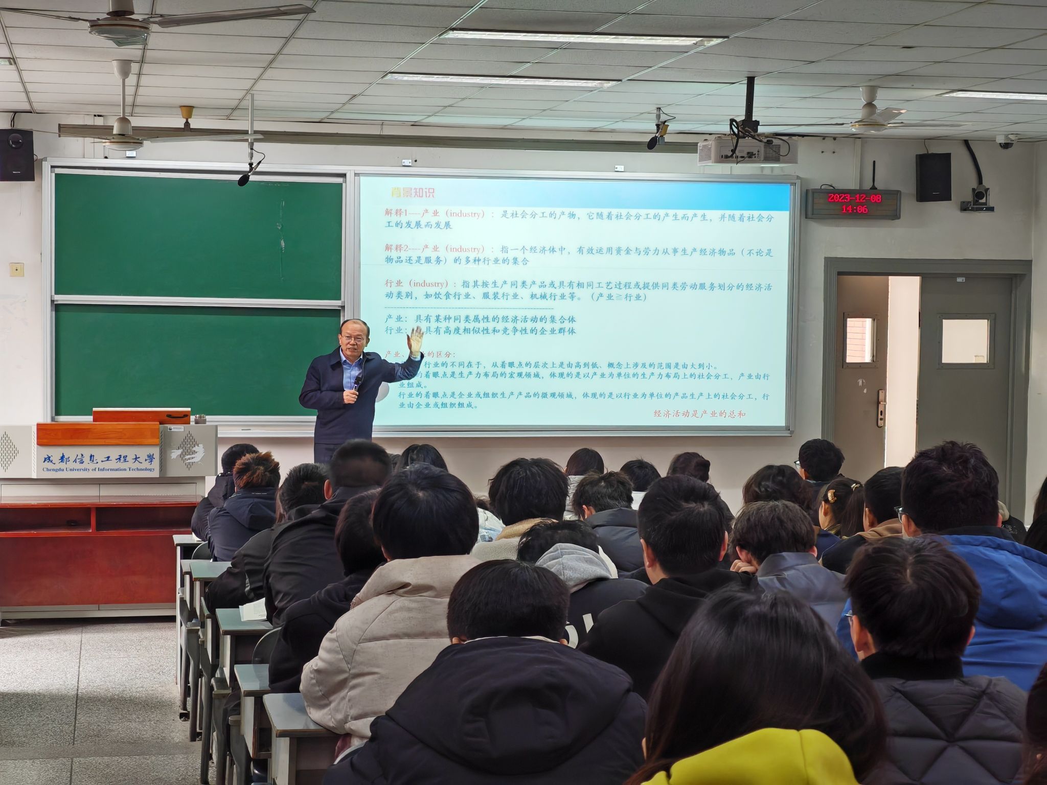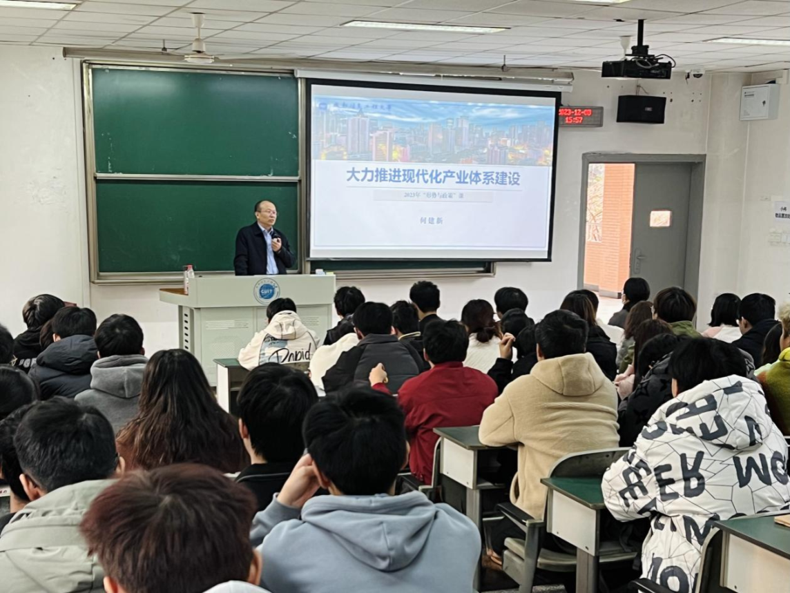 何建新阐述了国家在现代化产业体系建设的大方向、大格局,并从“推进现代化产业体系建设——四川‘有为’、成都‘有为’”两个方面介绍了四川省和成都市在推进新型工业化、建设现代化产业体系“做什么”和“怎么做”的具体举措。他强调,抓紧产业现代化这一关键,巩固现代化产业体系的基础,构建具备韧性的产业链供应链,以确保产业、经济和国家安全稳固可靠地掌握在自己手中,嘱咐同学们作为新时代青年,要努力学习,练就过硬本领,在新一轮产业升级中抓住机遇,为中国式现代化发展贡献力量。