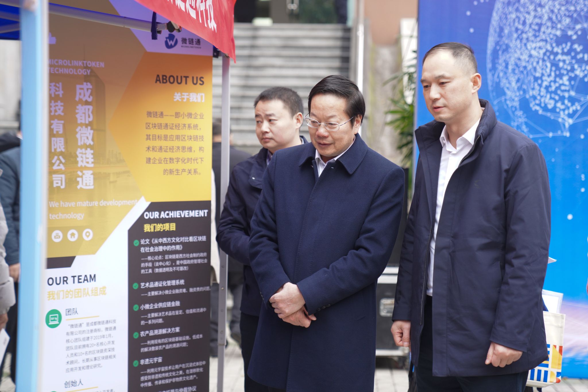 活动期间,成都市区块链产业发展联盟举行会员代表大会,同意了余敏明辞去联盟理事长的申请,选举了斯雪明为联盟新理事长,聘请了余敏明、周定文为联盟名誉理事长,陈钟为学术委员会主任、金键为发展委员会主任。沈火明代表学校感谢联盟对学校人才培养工作的支持,同时希望和各位联盟会员单位加强思想碰撞、加深合作对接,创造更多成绩。