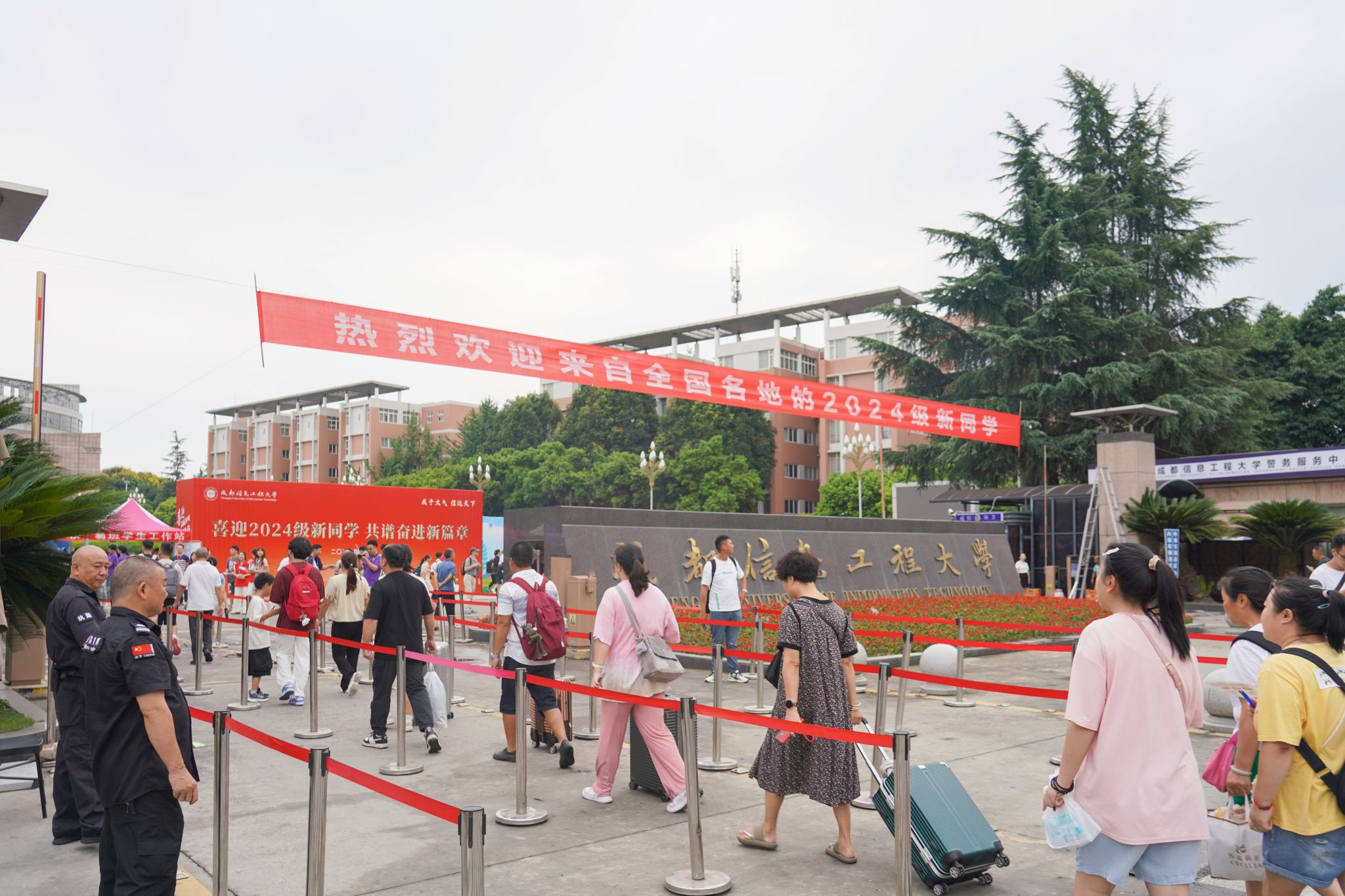 为了让新生们顺利开启大学生活,学校精心筹备安排,在火车站、机场等接站点热情迎接护送学生和家长安全到校。在学校正大门醒目位置,学院接待点和学生志愿服务点整齐排列,志愿者们忙碌的身影穿梭其中,他们帮助新生搬运行李,协助办理报到手续,提供防范网络和电信诈骗宣传资料,热情地介绍校园环境并解答疑问。