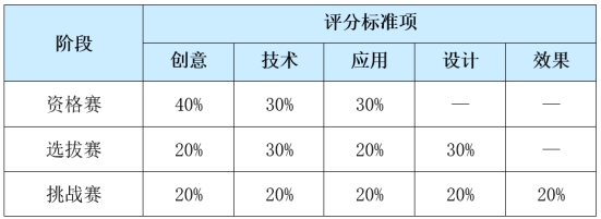 竞赛分为三个阶段:资格赛、选拔赛与挑战赛。竞赛各阶段的作品形式与评审形式见表1。A系列作品的评价标准概要见表2,B系列作品的评价标准参见本规程附件中的相应赛项指南。
