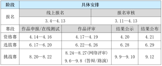 竞赛报名2024年3月4日启动,2024年4月13日截止。竞赛各阶段的时间安排见表5。如遇客观因素造成的不可抗拒力,组委会可能会就相关时间安排进行必要的调整;如有调整,将通过大赛官方网站、微信公众号等渠道提前通知。