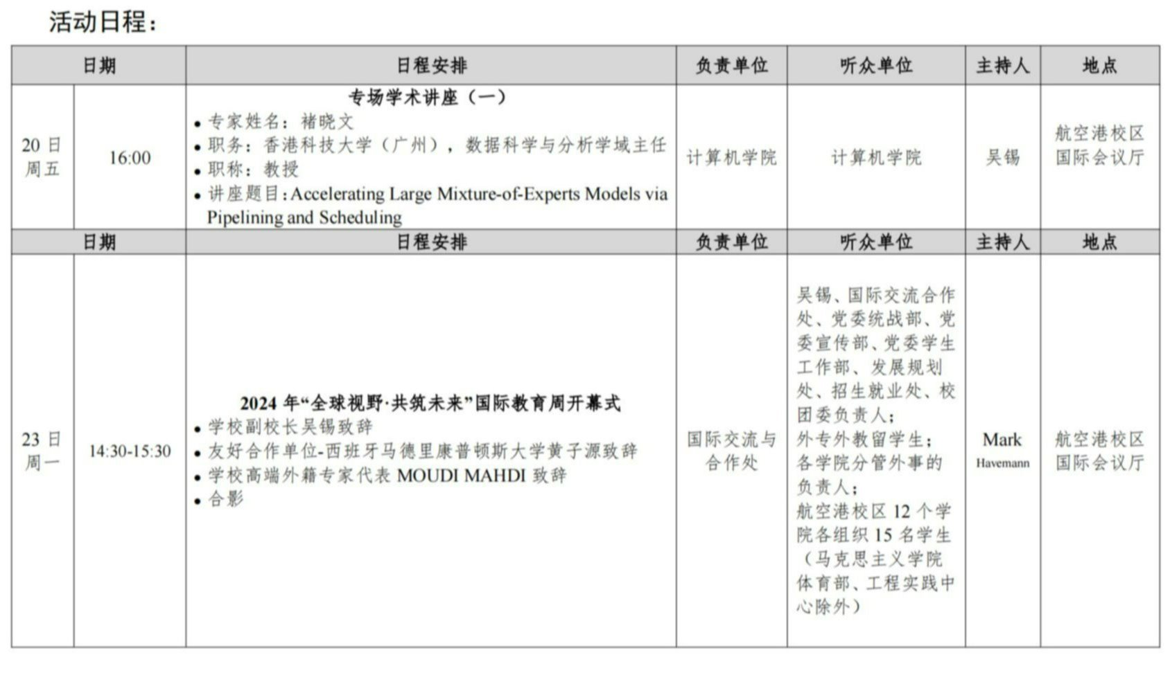 学校将于2024年9月20日至27日举行“全球视野·共筑未来”国际教育周活动。该活动核心聚焦于学生成长与全球视野拓展,通过多元化、互动式的交流平台,深化学生对国际议题的理解。组织国际学术沙龙,鼓励学生围绕跨学科议题自由发言,激发创新思维;并推出名师课堂,邀请各领域名师授课,打破地域限制,让学生随时随地享受全球优质教育资源。还将举办海外升学与就业辅导会,为学生量身打造个性化发展路径。整个教育周以学生为中心,旨在通过实践活动与理论学习相结合,提升学生的国际竞争力与跨文化交流能力,为其成为具有国际视野的复合型人才奠定坚实基础。现将活动日程安排通知如下,欢迎广大师生积极参与!