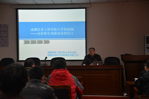 宫冠英在宣讲会上作了题为“成都信息工程学院大学科技园——高校师生创新创业的沃土”的宣讲报告。