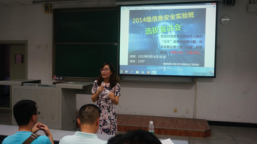 【本网讯】5月26日,信息安全工程学院2014级信息安全实验班选拔宣讲会在1107教室成功召开。参加此次宣讲会的有学院信息安全专业教研室主任吴春旺老师,2014级信息安全实验班班主任王祖俪老师,2014级信息安全实验班辅导员贾茜老师以及为此次实验班的选拔进行技术培训的道格小组成员和所有有志于考入信安实验班的同学们。