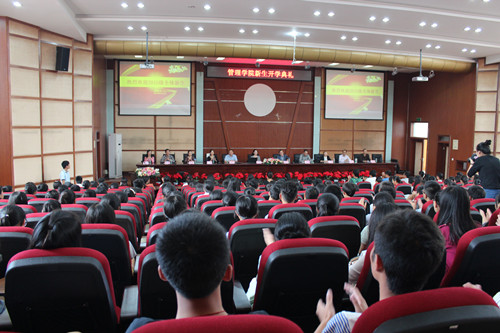 【本网讯】9月25日下午,管理学院在龙泉校区学术报告厅举办了2015级新生开学典礼。管理学院院长黄萍、副院长沈登学、党总支书记陶若铭、副书记杨勇、各专业教研室主任以及新生辅导员参加了见面会。见面会由陶若铭主持。