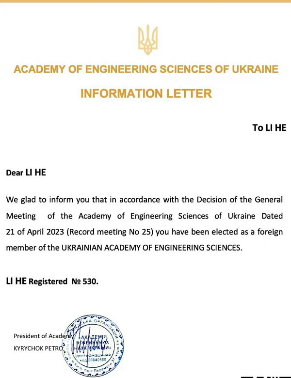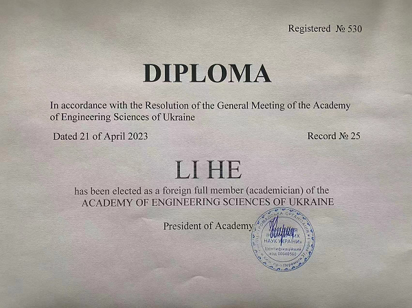 李贺教授当选乌克兰国家工程院外籍院士证书
