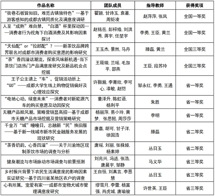 研究生组总决赛采取“报告陈述+答辩”的形式。5月18日分组赛共有来自学界业界40位专家组成的8个评审组,对150支团队进行答辩评审,综合报告分和展示答辩分,评出国赛一等奖和二等奖。我校研究生竞赛团队瞿颖、甘诗玉、袁著、周钜凌的作品《“街巷石板皆如旧,难觅古镇独特色”—基于游客感知的成都古镇同质化及满意度调研》(指导教师:赵萍萍、张凤)和赵铭岳、彭梓翛、刘洪秀、蒋宇、任堃宇的作品《人至“成熟”难自禁,“白酒”杯里探动因——消费者行为视角下白酒消费及其影响因素探讨》(指导教师:李勇、王臣、黄兰)获得本次大赛全国一等奖。