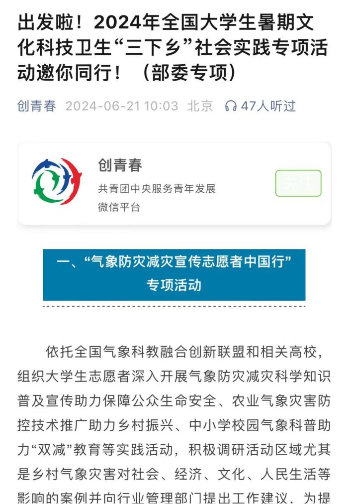 【本网讯】近日,共青团中央发布了2024年全国大学生暑期文化科技卫生“三下乡”社会实践活动专项名单。我校承办的“气象防灾减灾宣传志愿者中国行”大型科普活动继2023年首次入选全国大学生暑期文化科技卫生“三下乡”社会实践活动13个专项之后,今年,该活动成功入选全国4个“部委专项”之一。