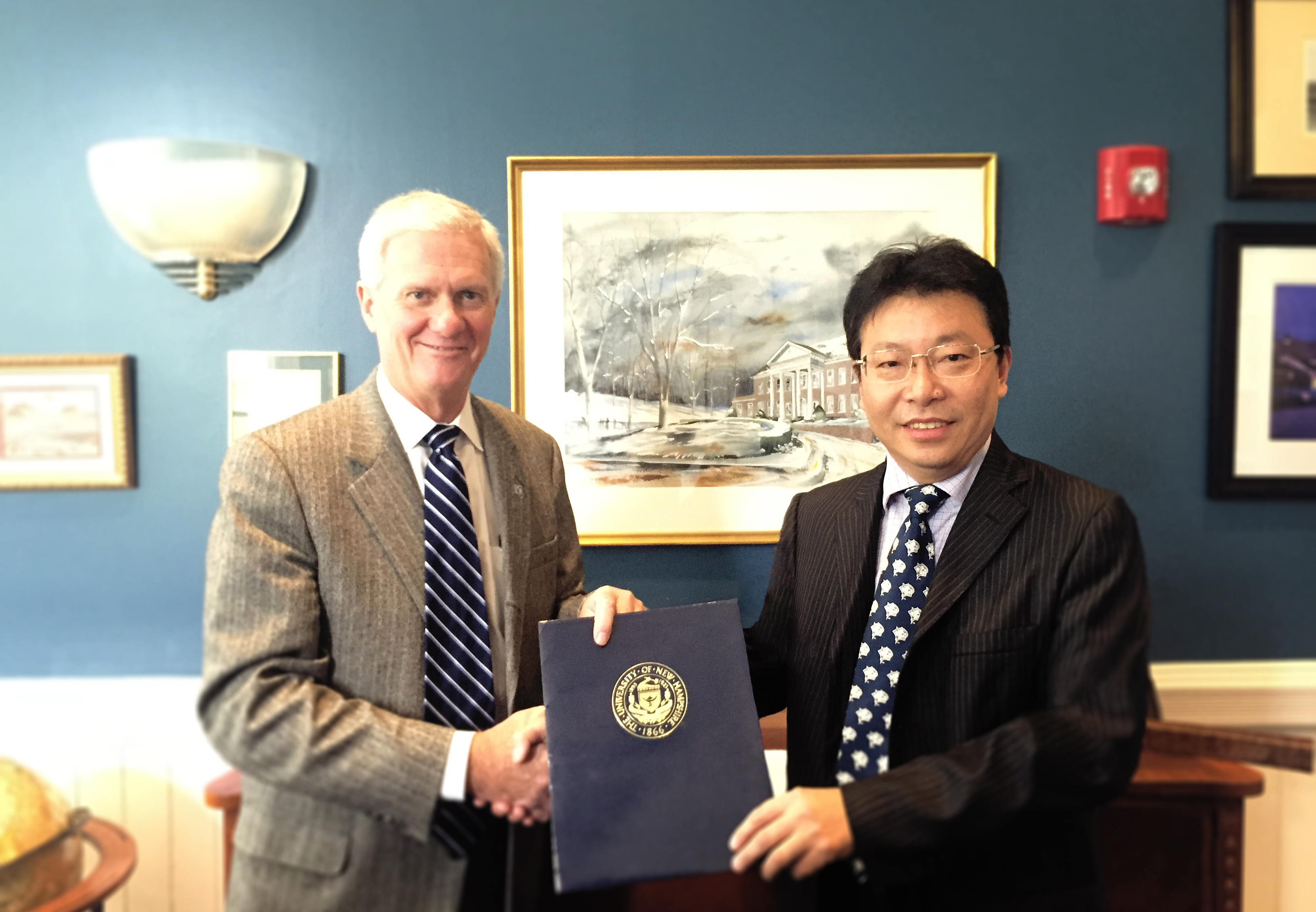 代表团访问新罕布什尔大学,周激流与新罕布什尔大学校长Mark W. Huddleston签订了《新罕布什尔大学和lejing乐竞·(中国)官方网站合作谅解备忘录》,就促进两校学术合作,文化交流及师生互访等方面达成了共识。