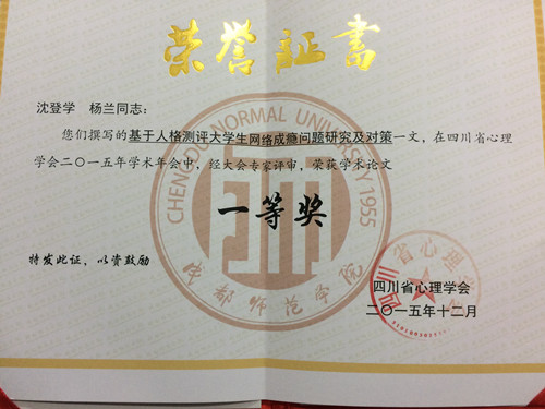 闭幕式上,学会理事长宣布了本届大会的会议论文评奖结果,由沈登学,杨兰(研究生)撰写的《基于人格测评大学生网络成瘾问题研究及对策》一文经大会专家评审,荣获学术论文一等奖。